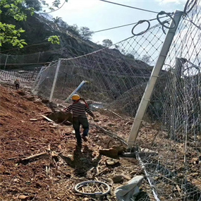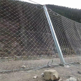 材質(zhì):鋼絲繩網(wǎng)、支撐繩和減壓環(huán)構(gòu)造:由鋼絲繩網(wǎng)或環(huán)形網(wǎng)(需攔截小塊落石時(shí)附加一層鐵絲格柵)、固定系統(tǒng)(錨桿、攔錨繩、基座和支撐繩)、減壓環(huán)和鋼柱四個(gè)主要部分構(gòu)成。